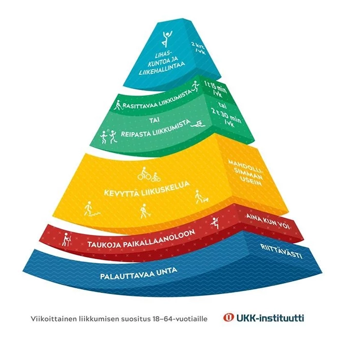 Usein meille esitetty kysymys kuuluu: Kuinka usein ja kuinka paljon minun tulisi liikkua. Yleisesti voisi vastata, että sopiva liikunnan määrä on se, joka auttaa sinua voimaan hyvin: Tunnet itsesi energiseksi, suoriudut asioista, joita haluat tehdä, nukut hyvin ja kehossasi ei ole kiputiloja. Optimaalinen liikunnan määrä on kuitenkin varsin henkilökohtainen, johtuen jo siitä, että meillä on paitsi erilainen perimä, erilaiset tarpeet niin myös usein varsin erilainen arki. Puhumattakaan siitä, että olemme eri ikäisiä. Tämän takia on liikunnan määrälle asetettu erilaisia yleisiä tavoitetasoja ja suosituksia. Yleisimmin Suomessa puhutaan UKK Instituutin liikuntapiirakoista. Niitä on kaksi erilaista, toinen on 18-64 -vuotiaille ja toinen yli 65 -vuotiaille.